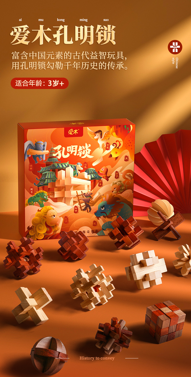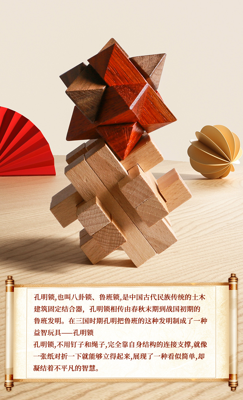 Dive into the world of traditional Chinese ingenuity with our Love - Wood Kongming Lock. Also known as Luban Lock, this classic puzzle is far more than just a toy—it’s a living heritage of ancient Chinese wisdom. Its roots trace back to the craftsmanship of Lu Ban, a revered master artisan in ancient China, and it later gained widespread popularity as an educational toy during the Three Kingdoms period, thanks to the legendary strategist Zhuge Liang (also called Kongming), who refined its design. For centuries, this timeless puzzle has captivated curious minds across generations.