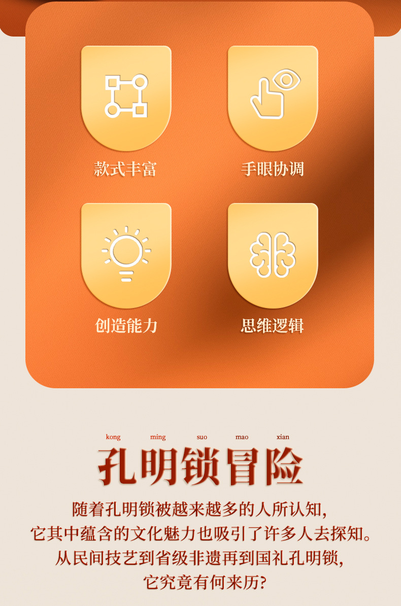 Rich Chinese Elements: Every Kongming Lock is a mini - masterpiece, infused with the essence of traditional Chinese culture. Holding it feels like clutching a fragment of history, seamlessly blending artistic charm with brain - teasing puzzle fun.